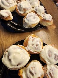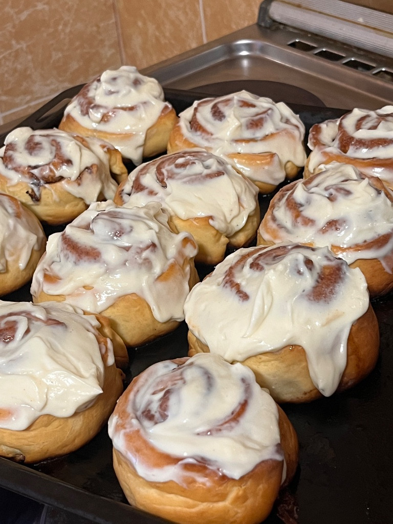 Испекла булочки) Получились очень вкусные, ничем не уступают настоящим булочкам Синабон) С тестом приятно было работать, только нужно очень хорошо защипывать, чтобы булочки не разворачивались) Пекла 18 минут) Несколько булочек заморозила, потом разморозила за 2 минуты в микроволновке, и свежеиспеченные булочки готовы)