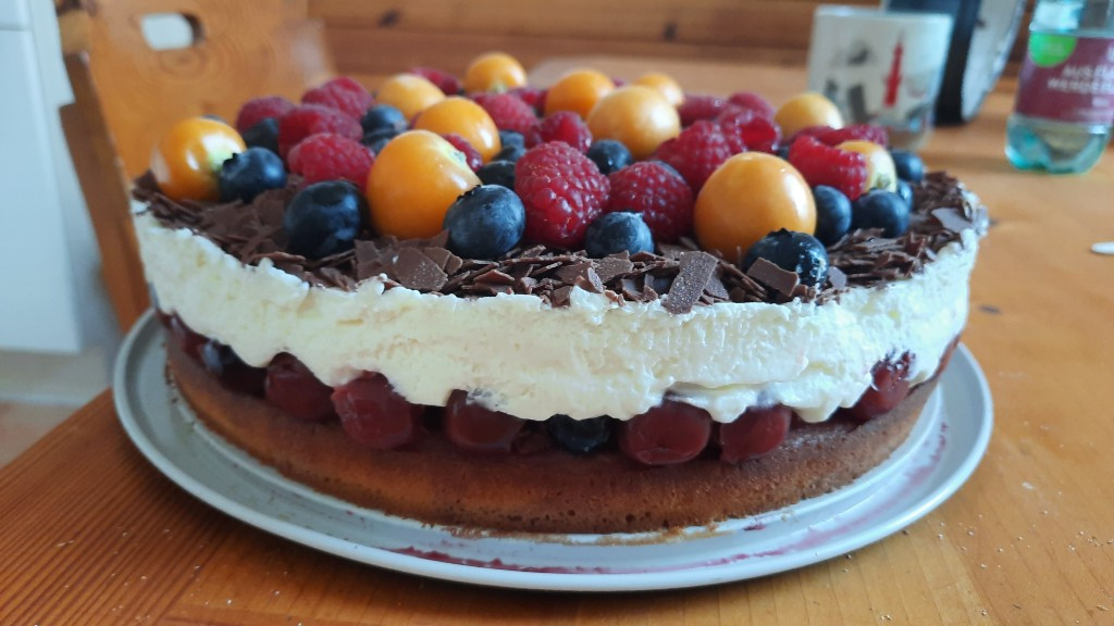 Шикарный рецепт! Мой любимый торт. На все праздники его делаю — всегда улетает. Сначала делала всё по рецепту — сверху шоколад и все. Потом стала ещё добавлять слой свежих ягод перед подачей. Сейчас ещё стала ягоды заливать желе, чтобы не разбегались. Но даже базовый вариант дико вкусный. Обычно кладу чуть на 40–60% меньше сахара в сливки, тк не люблю много сладости — получется отлично.