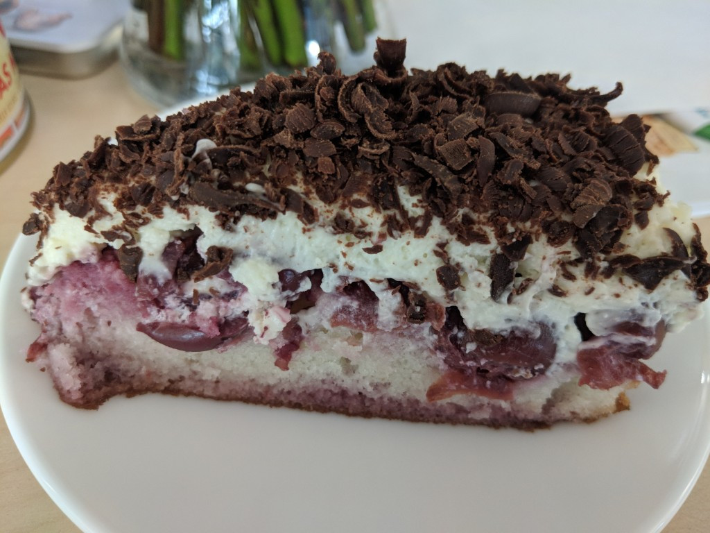 Этот тортик уже 2 раза за эту неделю приготовила, домашние в восторге. Первый раз делала все по рецепту, использовала ягоды из вишневого компота и замороженную вишню, немного пропитала торт компотом, готовила накануне праздника, пропитался немного, на 2 день отлично пропитался и стал ещё вкуснее. Второй раз маскрапоне в магазине не оказалась, взяла 2 детских творога и йогурт без добавок + 2 пакета замороженной вишни. Во второй раз сливки не взбились, сама виновата не нашла инфо как это правильно делать . Что получилось . Взбивала сливки минут 20, потом добавила творожки и немного йогурта, но все равно казался жидковатым .Корж во 2 раз залила оставшимся с 1-го раза компотом + соком из замороженных ягод. И в холодильник часа на 3–4. Получилась проста бомба. Сливки с творожком застыли, корж пропитался как надо . Получилось даже вкуснее, чем в первый раз!