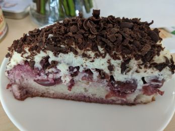 Готовлю этот тортик уже не первый год, все в восторге! Съедается правда очень быстро🥲 Готовится быстро, вишню беру замороженную, потому что не люблю сладкое, крем отличный, дети ругаются, когда кто-то съел больше! Спасибо!