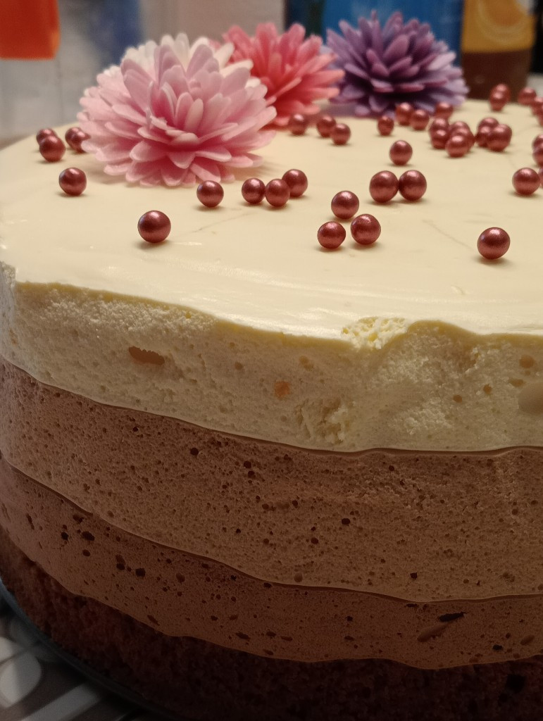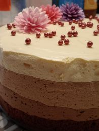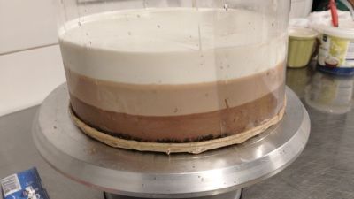 Обратите внимание, что для каждого слоя мусса мы используем разное количество желатина. Связано это с тем, что слой с горьким шоколадом стабилизируется лучше, чем с белым.