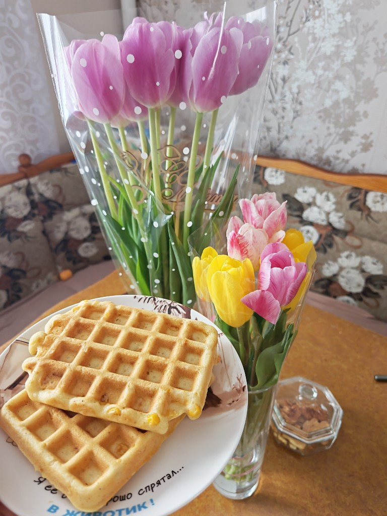 Эти яркие, как солнышко, вафли станут украшением завтрака. Подавать их можно с сыром, различными соусами и т.д.