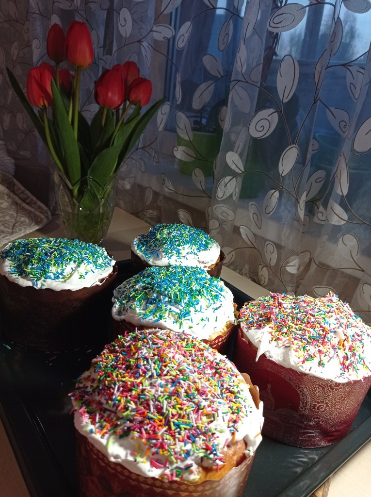 Из указанного количества ингредиентов получается 3 кулича высотой 11 см и шириной 17 см и 6 маленьких куличей высотой 7 см и шириной 6 см.
