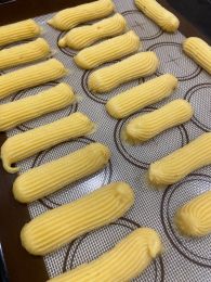 Ложкой или при помощи кондитерского мешка с насадкой (я использовала насадку открытая звезда) выложить тесто в виде трубочек длиной 11–12 см.